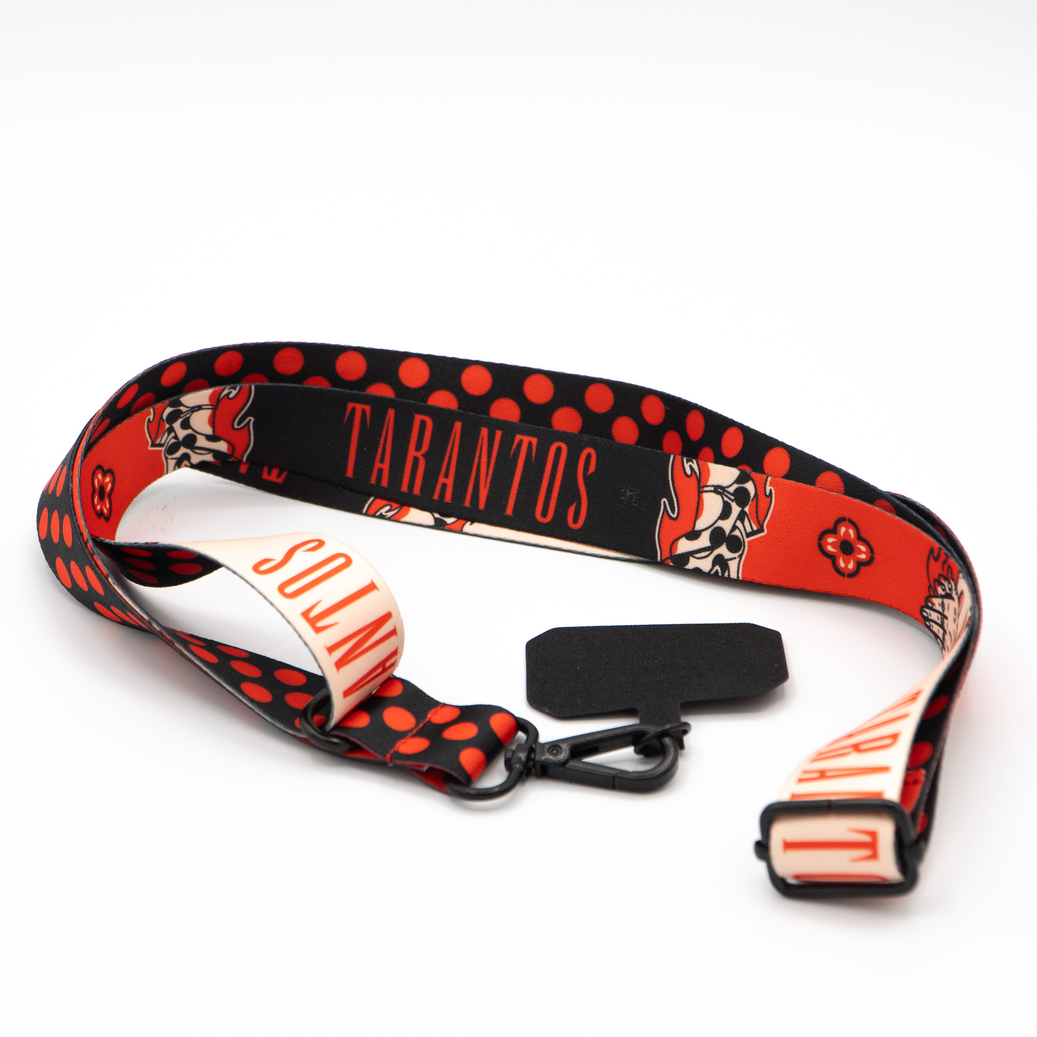 Lanyard Tarantos con mosquetón y accesorio para móvil.